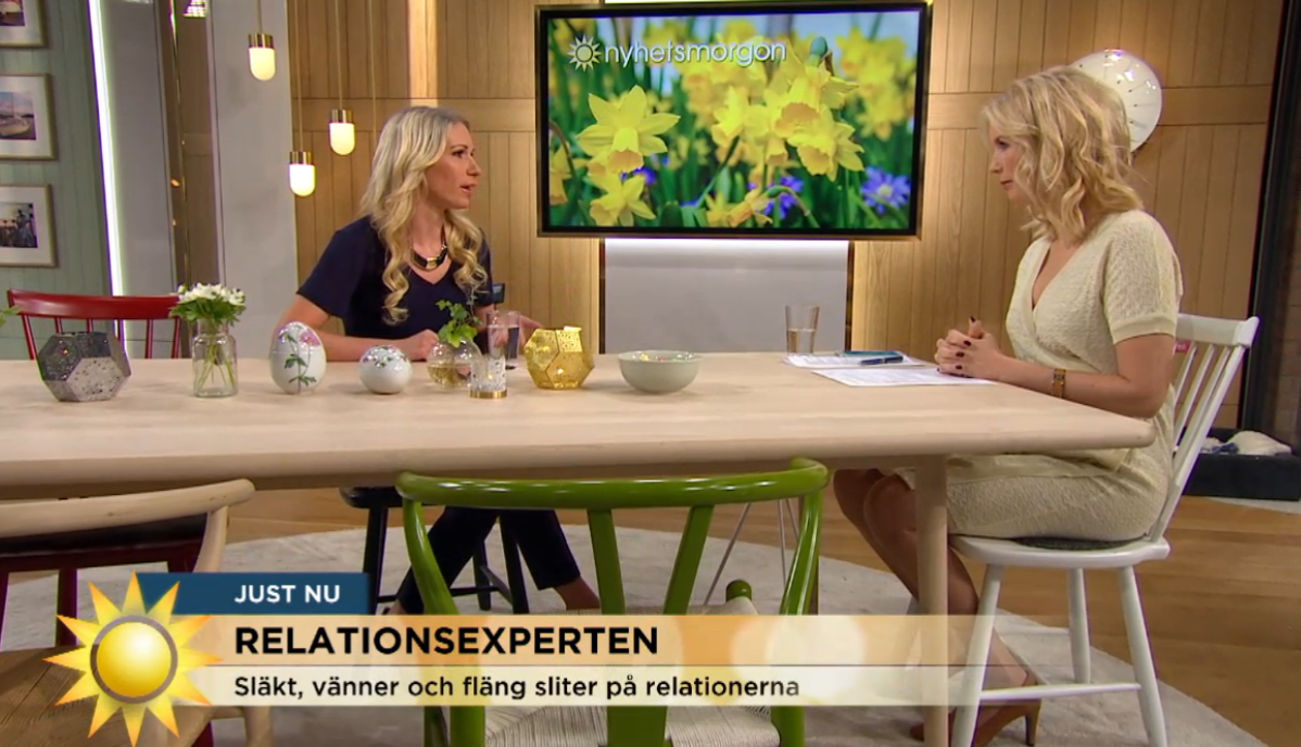 Strax innan påskhelgen satt jag åter igen i rutan som Nyhetsmorgons relationsexpert. Denna gång pratade jag och Jenny Strömstedt om konflikthantering och hur man ska “överleva” långhelgerna med alla sociala aktiviteter som står på schemat. Jag gav mina tips för att hålla relationerna så goda som möjligt under påskhelgen – och så svarade jag på tittarnas frågor om konflikter!