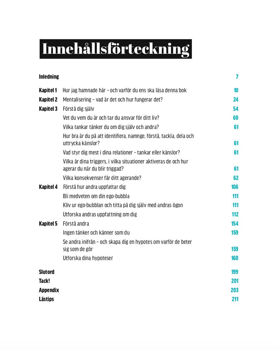 I boken förklarar Jacqueline Joo vad mentalisering är och ger dig konkreta verktyg dels för hur du kan tänka och agera i sociala situationer, och dels för hur du undviker knepiga fällor vi alla lätt hamnar i.